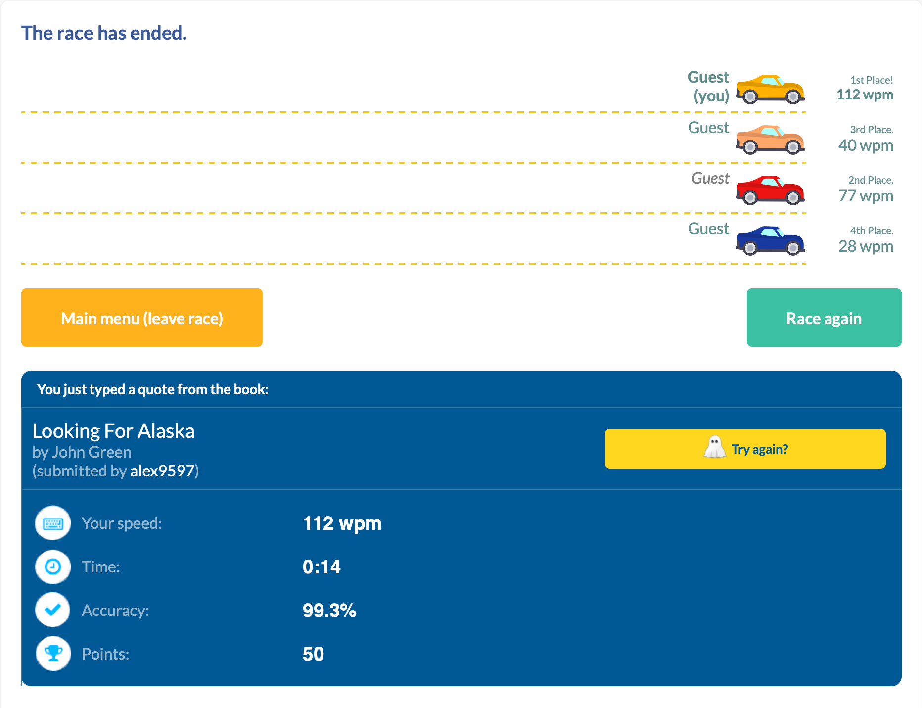 I thought I was going to get credit for finding a bug our school's software; while my teacher did call my parents that night, it was accuse me of hacking the typing software and changing my score. After explaining to her what I did, her first remedy suggested was a generous failing grade and suspension, but after apologizing to her and the staff, I was only forbidden from being crowned best typist at the school assembly. I may have not gotten an award, but I kept typing skills, reaching 55-65 WPM consistently.