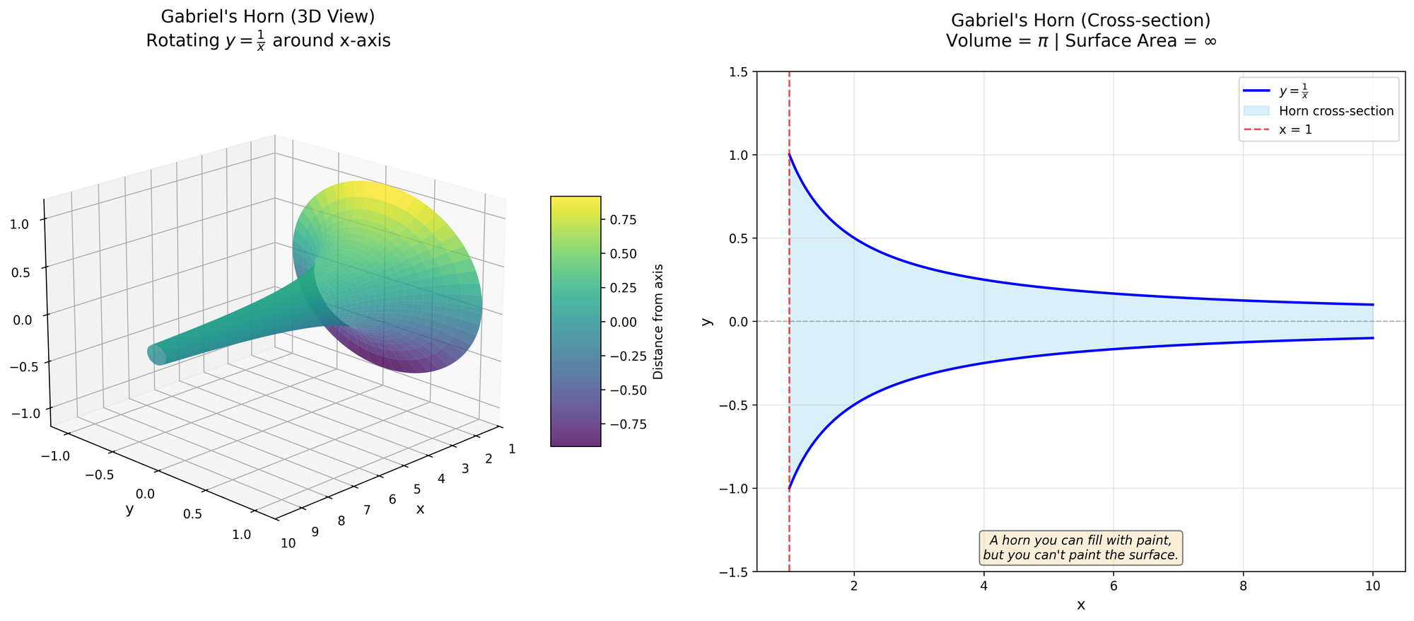Wait. It diverges. The volume is $V = \pi$, but the surface area is $A \geq \infty$. This isn't a mistake—the math checks out. And that's simply wonderful.